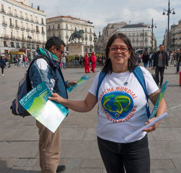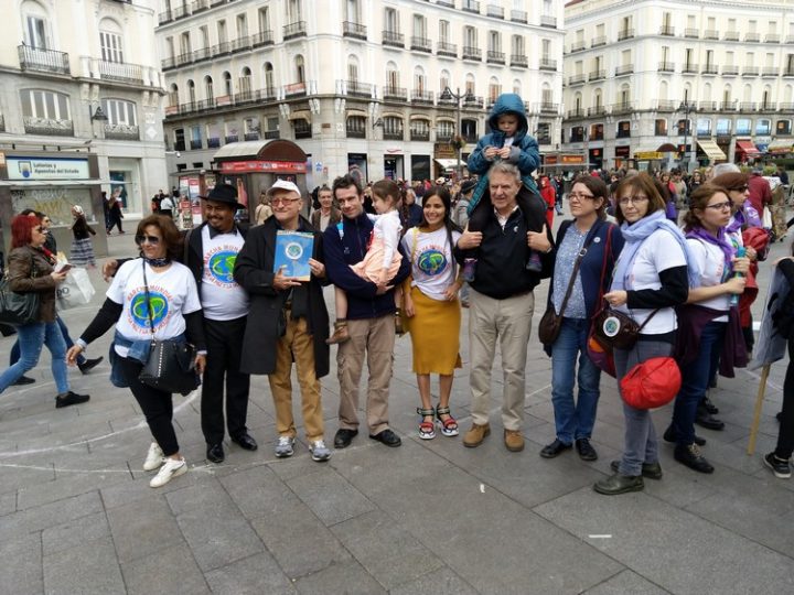 Des de les 11.00 h del matí un estrany ballet va tenir lloc a la Puerta del Sol enfront del Km 0 cridava l’atenció dels vianants. L’equip promotor de la MM de Madrid, amb alguns amics més arribats a les vespres des de Brussel·les i Tànger, estaven instal·lant l’equip de música i desplegant pancartes mentre es dibuixava a terra el símbol de la noviolència. Es va anar creant un cercle i al seu al voltant van començar a arremolinar-se curiosos. Marian, de «Mujeres caminando la paz”, a ritme de tambor, feia una crida a l’atenció, sobre el sentit d’aquest esdeveniment en aquest dia i va cedir la paraula a Rafael de la Rubia: «…després de cent cinquanta-nou dies tanquem aquí aquesta 2a Marxa Mundial per la Pau i la Noviolència. En aquest temps la MM ha realitzat activitats en 50 països i més de 200 ciutats i ha comptat amb un equip base, del qual hi ha aquí diversos presents, amb el que s’ha circumval·lat el planeta… Aquesta marxa està inspirada en els pares de la noviolència que ens han precedit, als qui hem homenatjat en el recorregut: M. Gandhi en el Sevagram Ashram (l’Índia) i Silo en el Parc Punta de Vacas (l’Argentina), entre altres…”. Després d’agrair als participants, va convidar a totes i a tots a sumar-se al projecte de la 3a Marxa!!!, d’aquí a cinc anys, en el 2024.