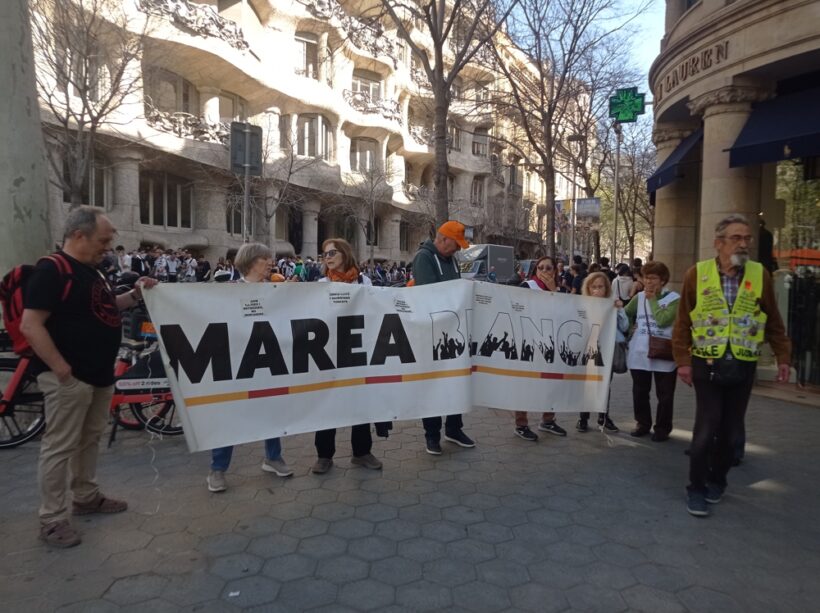 “La Marea Blanca de Catalunya avui,7 d’abril de 2025, manifesta que, més que mai, la nostra salut no està en venda.
