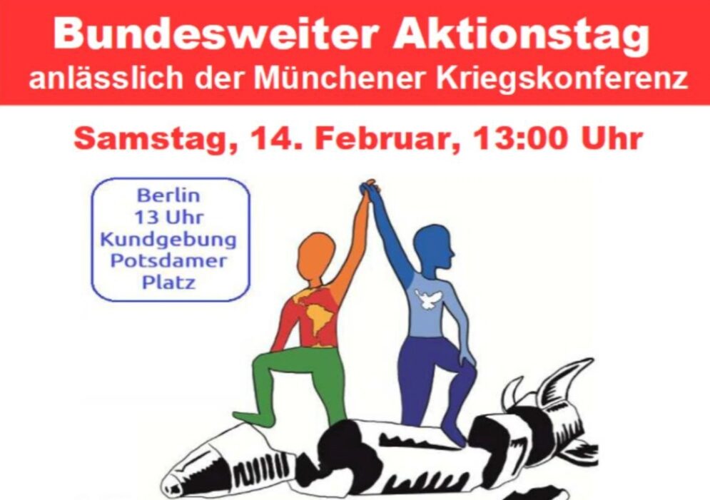 Samstag, 14. Februar 2026, 13:00 Uhr Potsdamer Platz, Berlin Veranstalter FRIKO Berlin Bundesweiter Aktionstag anlässlich der NATO-Kriegskonferenz in München. Für die Verwirklichung der UN-Charta und das Selbstbestimmungsrecht der Völker! Gegen den Staatsterrorismus der USA! Flyer und Aufruf https://frikoberlin.de/wp-content/uploads/2026/02/260214-Fuer-UN-Charta-Gegen-US-Staatsterrorismus.pdf Wir setzen…