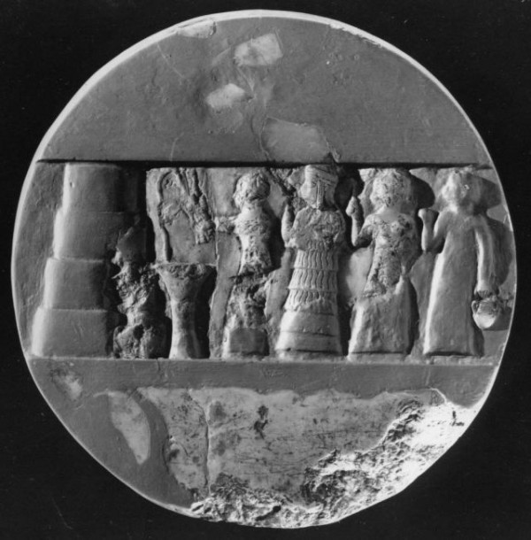 Die drei Inschriften auf der Scheibe identifizieren die dargestellten Figuren: Enheduanna, ein Beamter, ihr Haushofmeister und ihre Schreiberin. Die königliche Inschrift auf der Scheibe, lautet: „. Enheduanna, zirru-Priesterin, Frau des Gottes Nanna, Tochter von Sargon, König der Welt, im Tempel der Göttin Innana“ Die Figur der Enheduanna ist hervorstehend auf der Scheibe platziert, damit wird ihre Bedeutung in Beziehung zu den anderen aufgezeigt, ebenso wie ihre Position von großer Macht und Einfluss auf die Kultur ihrer Zeit.