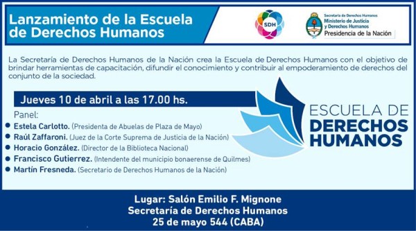 Buenos Aires. Das Sekretariat für Menschenrechte in Argentinien präsentiert am Donnerstag, den 10. April um 17:00 Uhr im Auditorium Emilio F. Mignone (25 de Mayo 544, CABA) die Schule für Menschenrechte. Deren Ziel ist es, Kurse und Mittel für den Erfahrungs- und Wissens-austausch die Stärkung der Rechte der Gesamtgesellschaft betreffend, anzubieten.