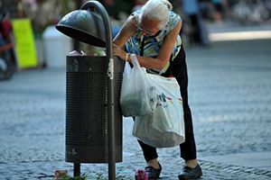 [media-credit name=“Eine Frau sucht in Mülleimern der thüringischen Stadt Weimar nach Pfandflaschen. (Foto: dpa)“ width=“300″]