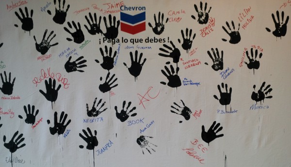 Was würden wir in Europa tut, wenn die größten Wald- und Grünflächen mit Giftstoffen kontaminiert wären? Warum wird nicht das Erdölunternehmen als Verursacher der Umweltkatastrophe zur Verantwortung gezogen? Diese Studenten zeigten ihren Protest mit ihrem eigenen Handabdruck an der Technischen Universität gegen „die schmutzigen Hände von Chevron“.