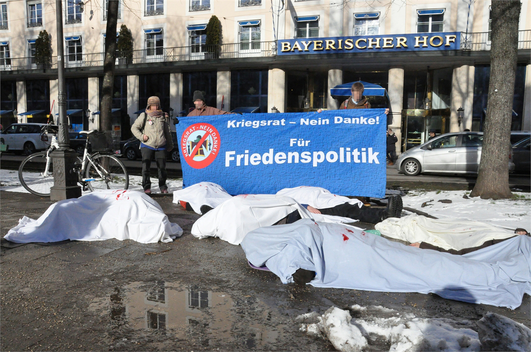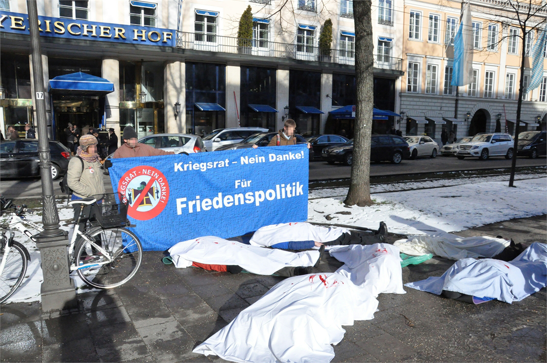 Gestern fand zum Auftakt der Proteste gegen die Münchner Sicherheitskonferenz am 6.2.-8.2.2015 vor dem Tagungshotel „Bayerischer Hof“ ein Die-In statt, bei dem sich AktivistInnen des Protestbündnisses „Kriegsrat – Nein Danke“ zum Gedenken an die Opfer von Gewalt und Krieg mit blutbefleckten „Leichentüchern“ bedeckt auf den Boden legten.