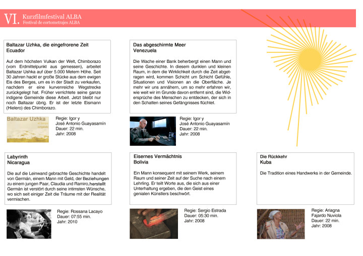 Es werden Kurzfilme aus dem Plurinationalen Staat Bolivien, aus der Republik Kuba, der Republik Ecuador, der Republik Nicaragua sowie der Bolivarischen Republik Venezuela gezeigt.