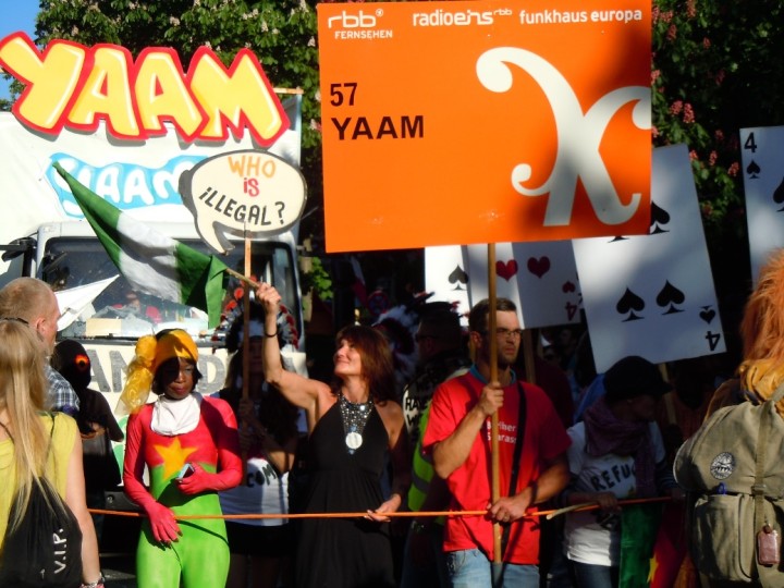 „Wir sind bereits Teil dieser Gesellschaft“, so knapp und klar drückt Samee, ein 32jähriger Pakistaner, es aus. Das ist der Grund, warum er findet, dass alle Lampedusa Flüchtlinge das Recht haben sollten, in Berlin zu bleiben, jenseits aller bürokratischen Prozeduren. Samee nimmt an der YAAM Karawane am Karneval der Kulturen teil. Er hat aktiv für die Einbindung der Flüchtlinge in ihrer neuen Heimat mitgewirkt. Als Mitglied des Refugee Club Impulse, einer Theatergruppe, die von geflüchteten Menschen ins Leben gerufen wurde, ist er jeden Tag in Kontakt mit den Bedürfnissen und Schwierigkeiten dieser Menschen: „Wir arbeiten jeden Tag mit Flüchtlingen und wissen, wie sie sich fühlen. Und sie fühlen, dass sie unsichtbar sind, dass sie nur wenig anerkannt sind“. Für ihn stellt das Theater ein machtvolles Werkzeug dar, um sie sichtbar zu machen und Brücken zur deutschen Gesellschaft aufzubauen: „Unser Ziel ist es, die Einstellung der Leute zu verändern. Wir wollen den Deutschen zeigen, dass wir ein friedliches Leben führen wollen, genauso wie sie.“ Seiner Meinung nach sollte die Position der EU zur Situation der Flüchtlinge, die das Mittelmeer überqueren, sich auf die Menschenrechte fokussieren: „Es ist eine Tatsache, dass die Menschen migrieren, aus Libyen und so weiter, und sie werden das weiterhin tun. In diesem Szenario sollte Europa das Leben der Menschen an erste Stelle setzen, danach können sie anfangen, Gesetze zu machen.“