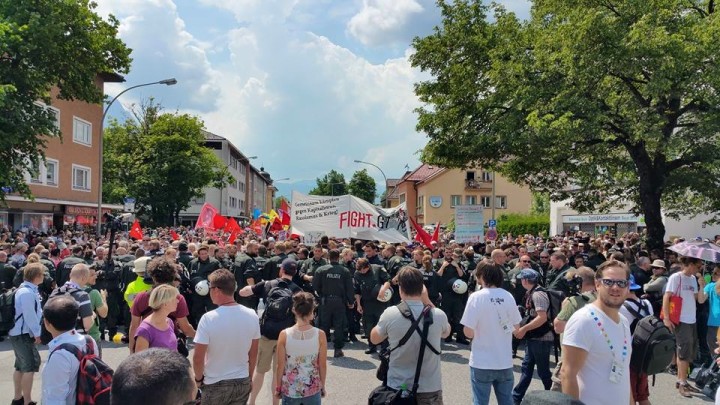 Bei der gestrigen Demonstration durch Garmisch-Partenkirchen mit bis zu 7500 Teilnehmern ging es zum größten Teil in derselben gewaltlosen, aber durchaus energievollen Weise weiter wie an den Vortagen. Alte und Junge vieler politischer Couleur protestieren mit kreativen Aktionen und Transparenten. Auch schienen sich die Bewohner von Garmisch neugierig bis freundlich und hilfsbereit gegenüber dem Treiben zu verhalten. Polizei war in großen Massen anwesend und stark ausgerüstet. Immer wieder wurde der Zug gestoppt und alle mussten warten, so zog es sich über viele Stunden hin und die Hitze (30°C) setzte allen zu. Unter diesen Umständen war die Gelassenheit, mit welcher fast alle Demonstrant_innen und Polizist_innen das weitere Geschehen abwarteten, bewundernswert.