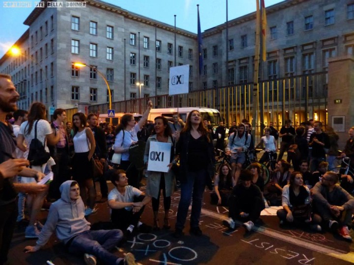 Mit dem Motto „Oxi – Schluss mit Lustig!“ versammelten sich gestern etwa 1200 Demonstrant_innen, um gegen die erneuten Sparauflagen im Zusammenhang mit dem dritten Hilfspaket für Griechenland zu protestieren. Spontan zogen sie dann weiter zum Finanzministerium. Sie kritisieren die harte Haltung der Bundesregierung und möchten den Griechen ihre Solidarität ausdrücken.