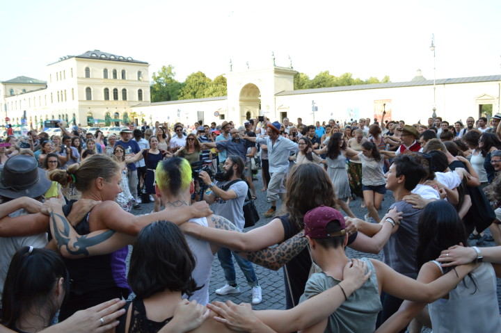 Am Donnerstag 19 Uhr versammelten sich dann ca. 200 Personen vor der SFCC. Die Band Unterbiberger Hofmusik eröffnete den Flashmob mit dem – in eigener Kreation bayrisch abgewandelten – türkischen Volkslied „Dere geliyor – ja schee blau“. Danach ging man zu einem griechischen Sirtaki über. Ca. 20 Minuten tanzten und lachten die Menschen Arm in Arm vor der SFCC. In der darauffolgenden kleinen Kundgebung ermunterte einer der Musiker die Anwesenden zu ihnen zu kommen, wenn sie auch eine derartige Situation erleben sollten. Sie würden dann schon dafür sorgen, dass Alltagsrassismus nicht unentdeckt bliebe.