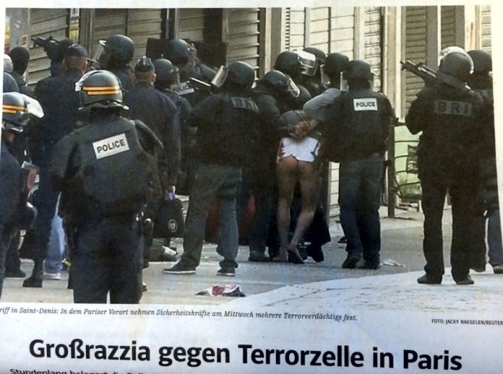 Am 17.11.2015 war als Aufmacher der Süddeutsche Zeitung (SZ) ein Photo abgebildet, welches das Ende der Großrazzia im französischen St. Denis zeigt. Darauf abgebildet: Spezialeinsatzkräfte, ein mit Handschellen abgeführter Mann, nach vorne gebeugt, sein blutverschmiertes weißes Hemd und – sein entblößter Hintern. Ist das nicht ein Detail zuviel, liebe SZ?