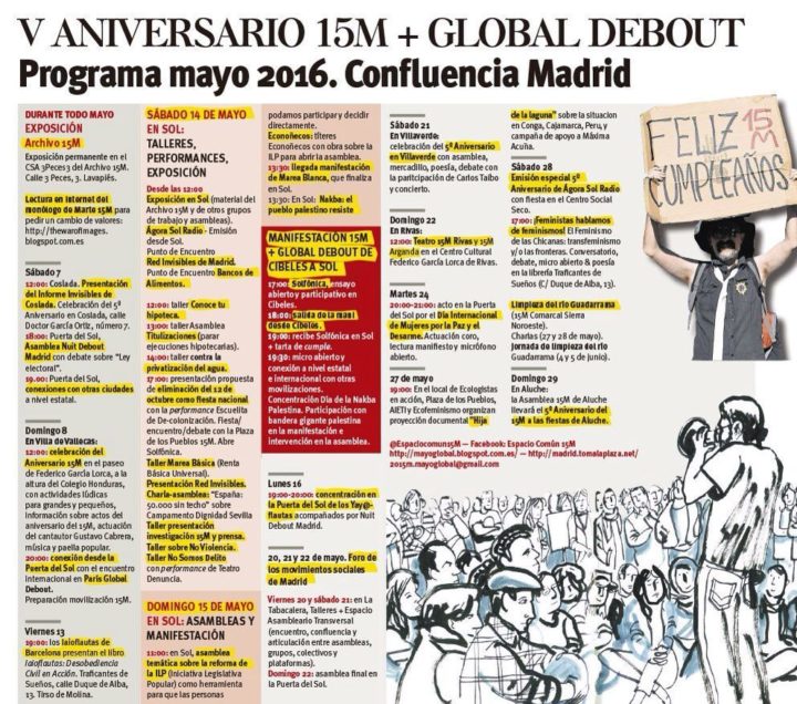 Dieses Wochenende beginnen die Hauptveranstaltungen der Feier des fünften Jahrestages von 15M oder Indignados (Empörten-Bewegung) in Spanien in Solidarität mit und wiederbelebt durch die französische „Nuit Debout“-Bewegung.