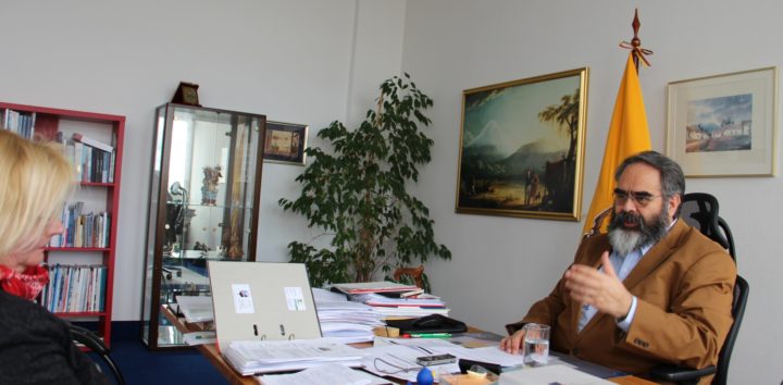 Am 7. April 2016 fand ein ausführliches Interview mit dem Botschafter der Republik Ecuador, Herrn Jorge Jurado statt. Direkt in der „City von Berlin“ am U-Bahnhof Kurfürstendamm in der Joachimsthaler Straße befinden sich die modernen, großen Räume der Botschaft. Am Eingang weht die Nationalfahne von Ecuador. Der Herr Botschafter Jurado wird sein Amt in den nächsten Wochen abgeben. Er ist ein hoch engagierter Diplomat. Ich freute mich sehr, dieses abschließende Interview mit ihm im Namen unserer internationalen Nachrichtenagentur „Pressenza“ führen zu dürfen.