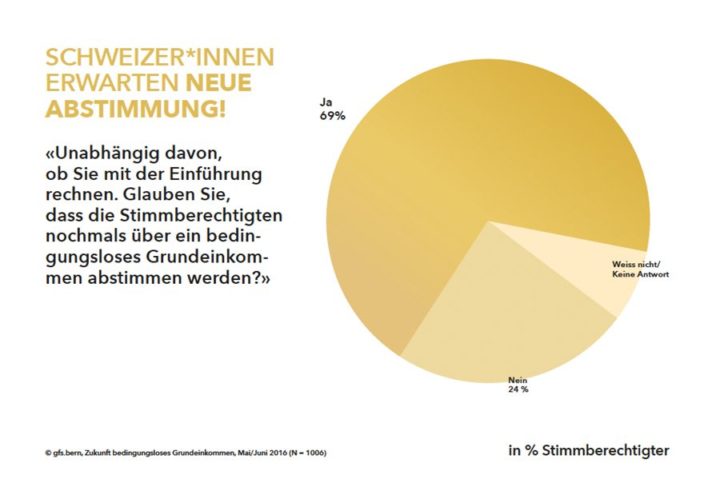 Die repräsentative Umfrage von gfs.bern zeigt, dass die weltweit erste Volksabstimmung über ein bedingungsloses Grundeinkommen einen Startpunkt für eine Debatte markiert. Fast zwei Drittel der Nein-Stimmenden und 83 Prozent der Ja-Stimmenden gehen davon aus, dass die Stimmberechtigten nochmals über ein bedingungsloses Grundeinkommen abstimmen werden.