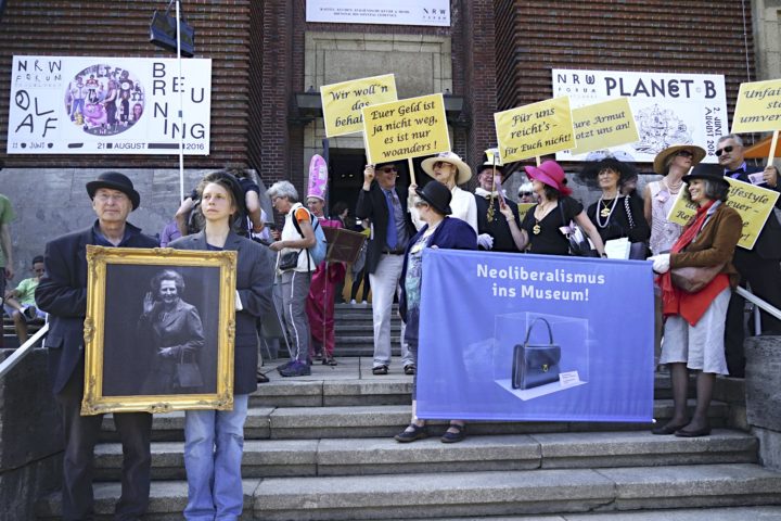 Unter dem Motto „Neoliberalismus ins Museum“ sind heute 250 Aktive des globalisierungskritischen Netzwerks Attac zusammen mit Kulturschaffenden in einer politisch-satirischen Performance durch die Düsseldorfer Altstadt gezogen und haben dabei verschiedenste Kunstwerke präsentiert: