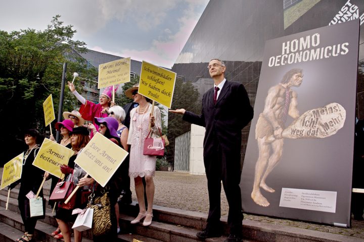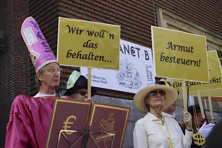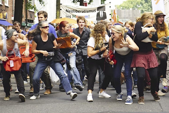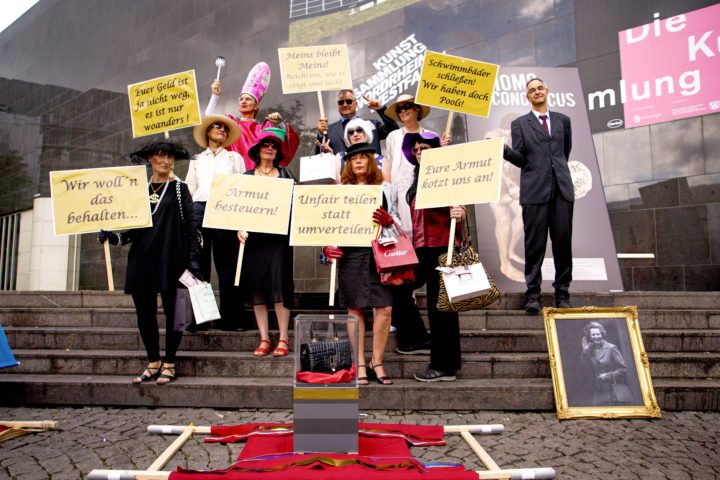 Unter dem Motto „Neoliberalismus ins Museum“ sind heute 250 Aktive des globalisierungskritischen Netzwerks Attac zusammen mit Kulturschaffenden in einer politisch-satirischen Performance durch die Düsseldorfer Altstadt gezogen und haben dabei verschiedenste Kunstwerke präsentiert: