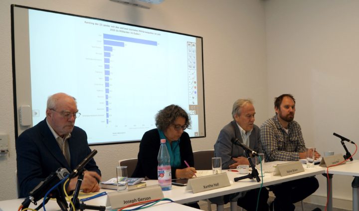 Joseph Gerson, Xanthe Hall, Reiner Braun und Lucas Wirl an der Pressekonferenz.