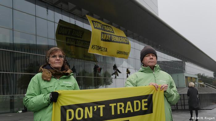 Die rund 30 Demonstranten vor dem Konferenzzentrum in Luxemburg schöpfen Hoffnung. Greenpeace-Aktivisten hatten sich mit Erlaubnis der Polizei an der Fassade des Gebäude abgeseilt. Einige wenige hielten grüne Plakate hoch und forderten, Freihandel dürfe nicht gegen Demokratie eingetauscht werden. Im Gebäude kamen die Handelsminister der Europäischen Union nicht voran. Der belgische Minister Didier Reynders konnte dem Handelsabkommen mit Kanada (CETA) nicht den letzten Segen geben, … weiter lesen