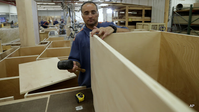 Ein Häftling arbeitet an einem Schrank bei Habitat for Humanity Prison Build in der Anstalt Ionia Correctional Facility in Ionia, Mich. (AP Photo/Carlos Osorio)