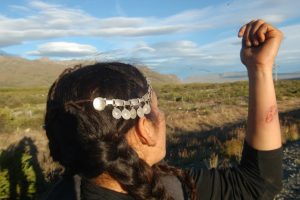 Protestierende Mapuche-Frau, mit Verletzung durch Gummigeschosse der Polizei, 2017; Quelle: patagoniafotopress.com.ar