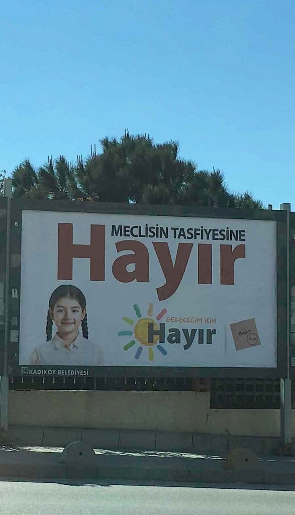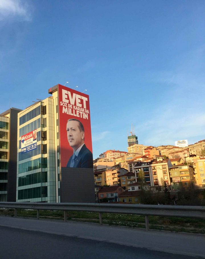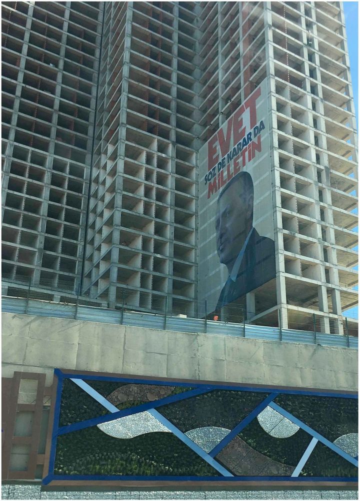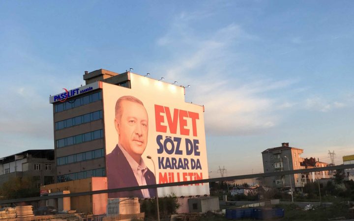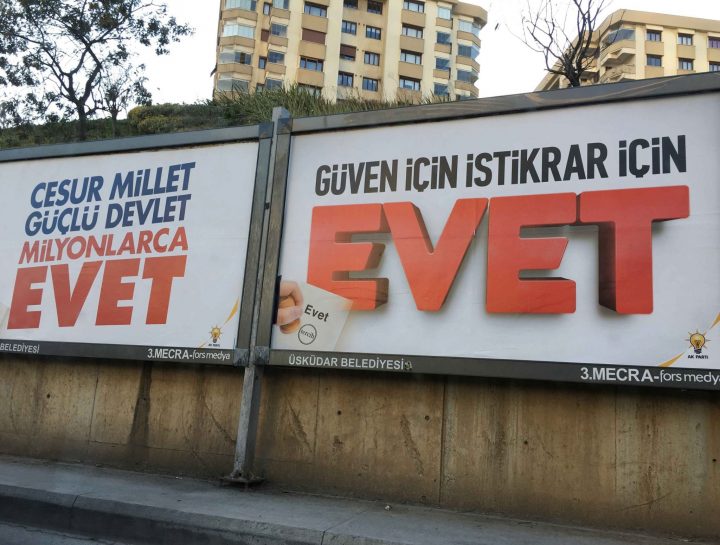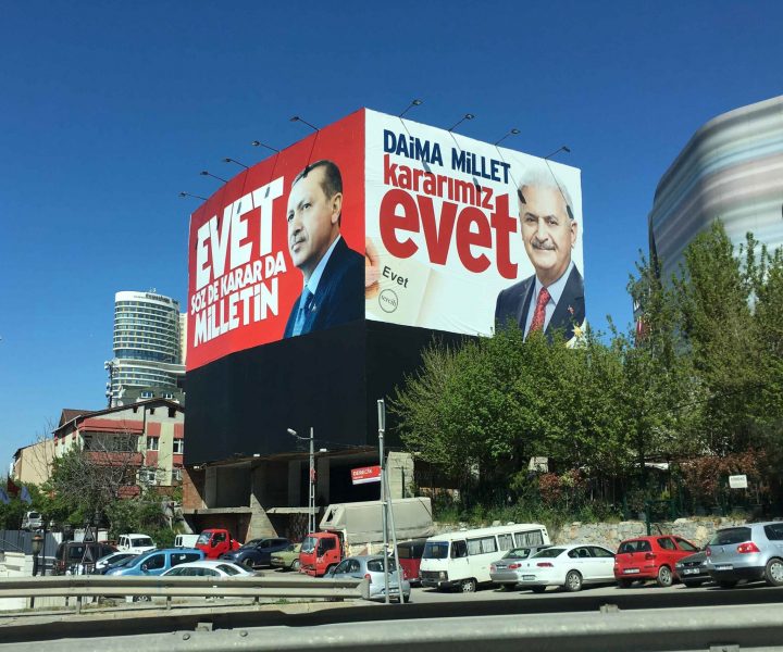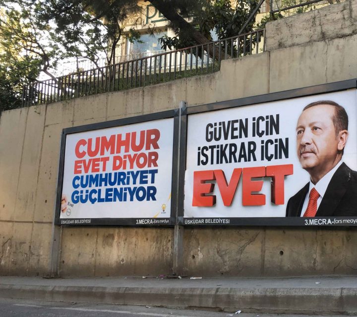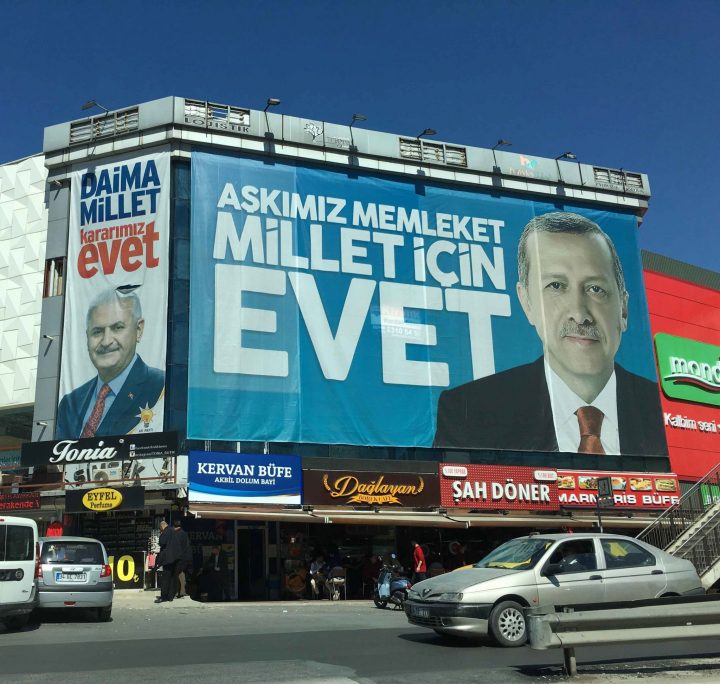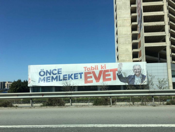 Auf hauswandhohen Plakaten, die auch die Fassaden von Hochhäusern abdecken, kommen einem abwechselnd die Konterfeis von Staatspräsident Recep Tayyip Erdoğan, seinem Ministerpräsidenten Binali Yıldırım – er votiert immerhin für die Auflösung seines Amtes! –, in kleinerem Format auch mal der Minister für Energie und Bodenschätze, der Schwiegersohn von Erdoğan, Berat Albayrak oder einfach nur ein großes „Evet“ – „JA“ entgegen.