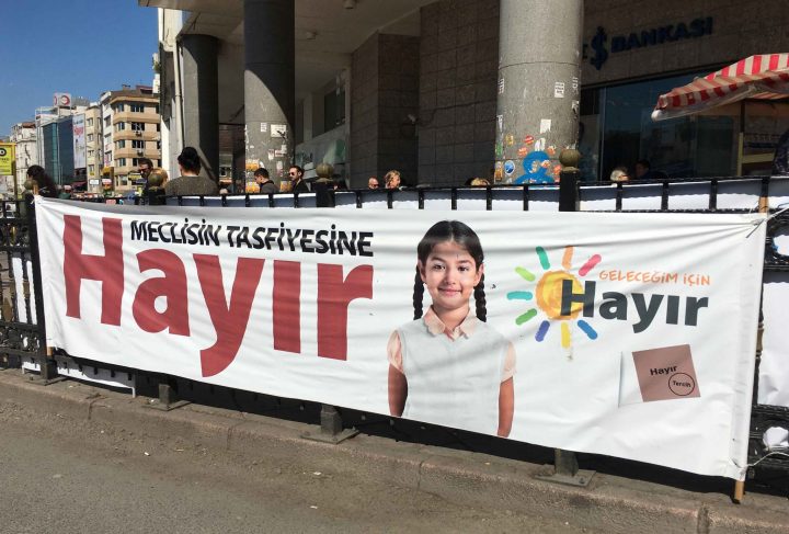 In deutlichem Kontrast zur „Ja-Kampagne“ am Bosporus steht die „Nein- Kampagne“. Um Werbung und Werbende des Nein-Lagers zu finden, muss man schon wissen, wo man suchen soll. Ist man auf der Stadtautobahn im asiatischen Teil der Metropole unterwegs, so muss man die Plakate und Transparente für ein „Hayır“ – „Nein“ regelrecht mit der Lupe suchen. In den meisten Bezirken der Großstadt, etwa im östlich gelegenen Pendik, dominiert, wie vielerorts in der Stadt, das „Evet“. Eines der in der Regel deutlich kleineren weißen Banner mit dem Wort „Hayır“, taucht hier, wenn überhaupt nur selten und ziemlich unscheinbar im Straßenbild auf.