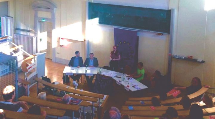 In der Runde sitzen Frank Zeitzmann (Rechtswissenschaftler), Dr. Franziska Brantner (B90/Die Grünen, MdB), Prof. Wolf Schünemann (Politikwissenschaftler), die Moderatorin Franziska Petri und DiEMs Thomas Seibert. Wo morgens in die Politische Theorie oder die Internationalen Beziehungen eingeführt wird, soll heute Abend über die Zukunft diskutiert werden, über Szenarien für die Zukunft der EU- genauer gesagt.