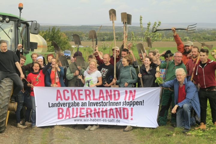 Sömmerda (Thüringen), 8.9.17. – Mit einer spektakulären Aktion protestierten Bäuerinnen und Bauern aus Ostdeutschland heute Morgen gegen Landraub. Sie pflanzten in einer ausgeräumten Agrarlandschaft 42 Apfelbäume auf ein 130-Hektar großes Ackerstück der Südzucker AG, das der Konzern sich widerrechtlich angeeignet hatte. Unterstützt wurden sie von den Teilnehmern der „Wir haben es satt!“-Aktionstour für eine andere Agrarpolitik, die vor der Bundestagswahl quer durch Deutschland führt. Im Anschluss weihten die Demonstranten feierlich die „Allee des Landraubs“ ein und übergaben sie der Gemeinde Sömmerda, der rechtmäßigen Eigentümerin der Flächen. Es handelt sich um den ersten Akt zivilen Ungehorsams, mit dem Bauern hierzulande gegen Landraub protestieren. Ihre Kritik: Immer mehr außerlandwirtschaftliche Investoren entziehen Landwirten Acker- und Weideland. So auch im Fall der insgesamt 2500 Hektar großen Fläche in Sömmerda, die der Großkonzern Südzucker im vergangenen Jahr für 29 Millionen Euro von der Terra eG, einer ehemaligen LPG, erworben hat.