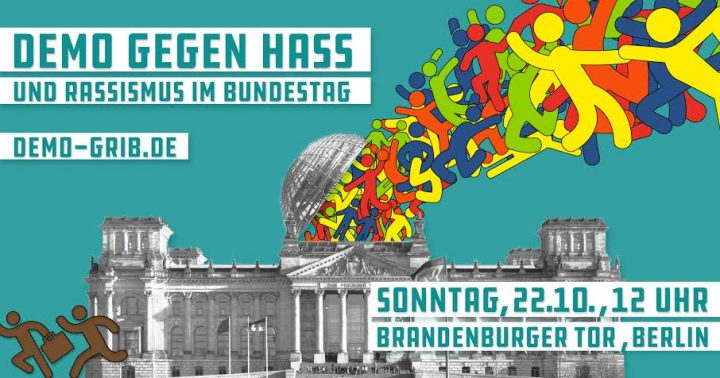 Eine Reihe von Organisationen wie Demokratie in Bewegung, Diem25, der Lesben und Schwulenverband und der DGB haben zu einer Großdemonstration gegen Hass und Rassismus in Berlin am Sonntag aufgerufen. Anlass ist der nächste Dienstag, der Tag, an dem der neu gewählte Bundestag zum ersten Mal zusammentritt.