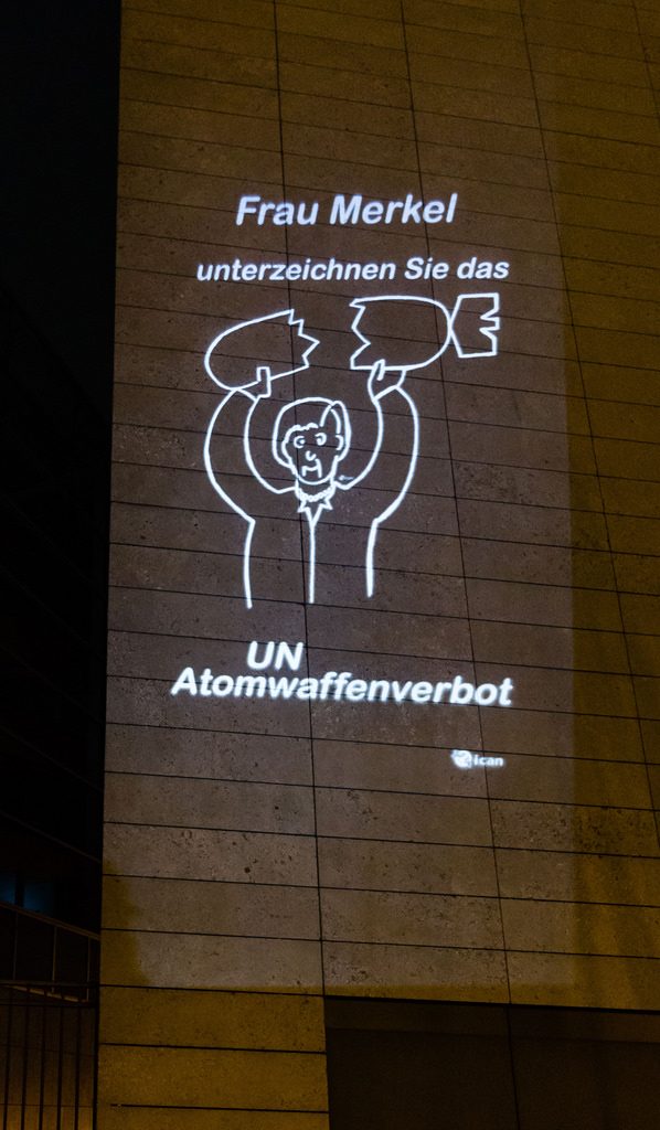 Unterstützer der mit dem Friedensnobelpreis ausgezeichneten Internationalen Kampagne zur Abschaffung von Atomwaffen (ICAN) wandten sich mit der Aktion in der Nacht auf Donnerstag direkt an die Kanzlerin und Parteivorsitzende: „Frau Merkel, unterzeichnen Sie das UN-Atomwaffenverbot!“ Außerdem war Angela Merkel mit einer durchgebrochenen Atombombe zu sehen.