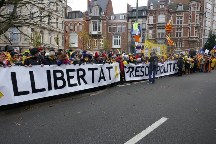 Der Tag der Demo begann mit niedrigen Temperaturen und einem konstanten Nieselregen. Treffpunkt war der Parc du Cinquantenaire, der wenige Meter von den europäischen Institutionen entfernt liegt. Schon lange vor dem offiziellen Beginn hatten sich tausende von Menschen eingefunden. Sie sangen katalanische Lieder und skandierten „Unabhängigkeit“ und „Freiheit“. Dabei wurde ein Käfig mit einem jungen Mann in Handschellen durch die Menge geschoben. Ein großes Schild an der improvisierten Gefängniszelle signalisierte „Solidarität mit den politischen Gefangenen“. Diese Aktion sollte auf die noch immer inhaftierten Politiker und Aktivisten aufmerksam machen, darunter die Vorsitzenden der ANC und Òmnium Cultural, Jordi Sánchez und Jordi Cuixart. Jordi Sànchez hat inzwischen seinen Vorsitz zugunsten seiner Kandidatur für die kommenden Regionalwahlen am 21. Dezember aufgegeben. Dennoch hat der Richter Pablo Llarena seinem Gesuch auf Freilassung aus der Untersuchungshaft, um sein Recht auf die Teilnahme am Wahlkampf auszuüben, nicht stattgegeben. Die Begründung: Es bestünde das Risiko, dass die Freilassung der beiden Vertreter der bisher durchgängig friedlichen Bürgerbewegung zu einer „Explosion von Gewalt“ führen könnte.