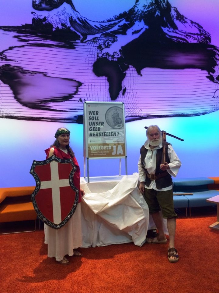 Vollgeld-AktivistInnen erinnerten heute in einer Aktion die Nationalbank daran, weshalb sie gegründet worden ist: Um das Schweizer Geld herzustellen. Eine ältere Aktivistin sprayte auf dem Berner Bundesplatz einen entsprechenden Spruch an die Absperrung zur Nationalbank. Tell und Helvetia erinnerten mit dem selben Spruch auch die SNB-Direktion und die Aktionäre an den ursprünglichen Zweck der Nationalbank.