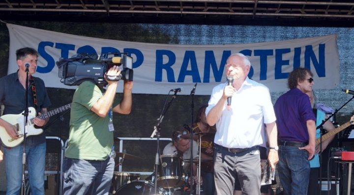 Vor den Toren der Air Base Ramstein sprach Oskar Lafontaine an der Abschlusskundgebung der Stopp-Ramstein Demonstration bei brütender Hitze vor über 5000 Friedensaktivist*innen.