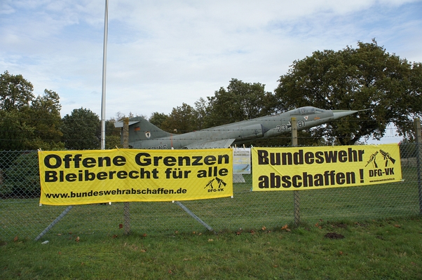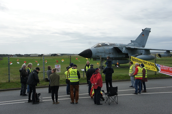 Die traditionsreiche Mahnwache „Zwei vor Zwölf“ um 11.58 Uhr vor dem Tor zum Drohnen- und Tornadostandort Jagel bei Schleswig stand am 19. Oktober 2019 unter dem Thema „Krieg ist gegen die Natur“. Dazu eingeladen hatten wie immer AktivistInnen der Deutschen Friedensgesellschaft – Vereinigte KriegsdienstgegnerInnen (DFG-VK) und der Initiative www.bundeswehrabschaffen.de. Gekommen waren engagierte Menschen aus Schleswig, Flensburg, Bad Oldesloe und Heide sowie erstmals auch zwei AktivistInnen von Fridays For Future aus Eckernförde, die eine Anreise von eineinhalb Stunden mit dem Fahrrad nicht gescheut hatten. Die Zufahrt zum Haupttor war beiderseits mit Transparenten versehen, wie auch der Eingangsbereich blockiert und entsprechend geschmückt wurde. Obgleich zu dieser Zeit der Flugbetrieb ruhte, war das beantragte Drachensteigen wie auch der gar nicht beantragte Einsatz von Luftballons untersagt wurden, weshalb das mitgebrachte Fluggerät am Zaun ruhen mußte.
