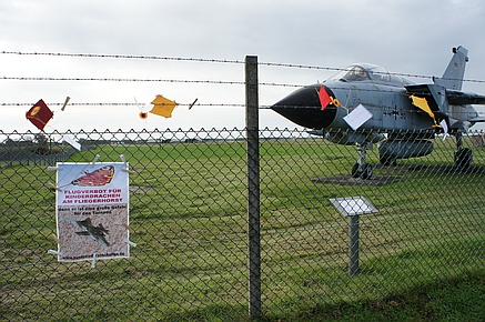 Um dem militärischen Flugbetrieb dennoch zumindest symbolisch einen antimilitaristischen Flieger entgegenzusetzen, lagen vorgedruckte Papierbögen bereit, die oben einen Tornado mit Qualmfahne und unten einen 200-Euro-Schein zeigten. Dazwischen stand zu lesen: „So fliegt Dein Steuergeld zum Fenster raus und hinten kommt Kohlendioxid heraus: Eine Tornadoflugstunde erzeugt 12.000 kg Kohlendioxid und 43.000 Euro Kosten. Falte dieses Blatt zu einem Papierflieger dann ist der Tornado verschwunden und es segelt nur der Geldschein davon.“