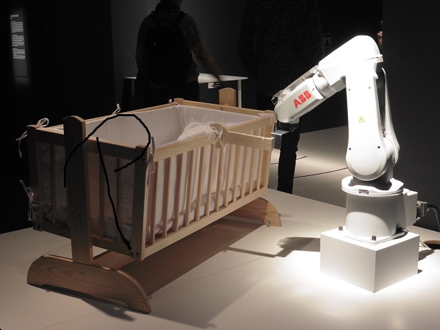„Optimierung der Elternschaft“, Objekt von Addie Wagenknecht (2012) in der Ausstellung „HUMAN+“ im Kunsthaus CCCB in Barcelona, 2015. (Foto: Elisabeth Voß)