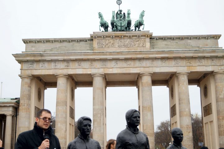 Nils Melzer, UN-Sonderberichterstatter über Folter bei seiner Rede am 27. November 2019 vor dem Brandenburger Tor. (Bild: Reto Thumiger, Pressenza)