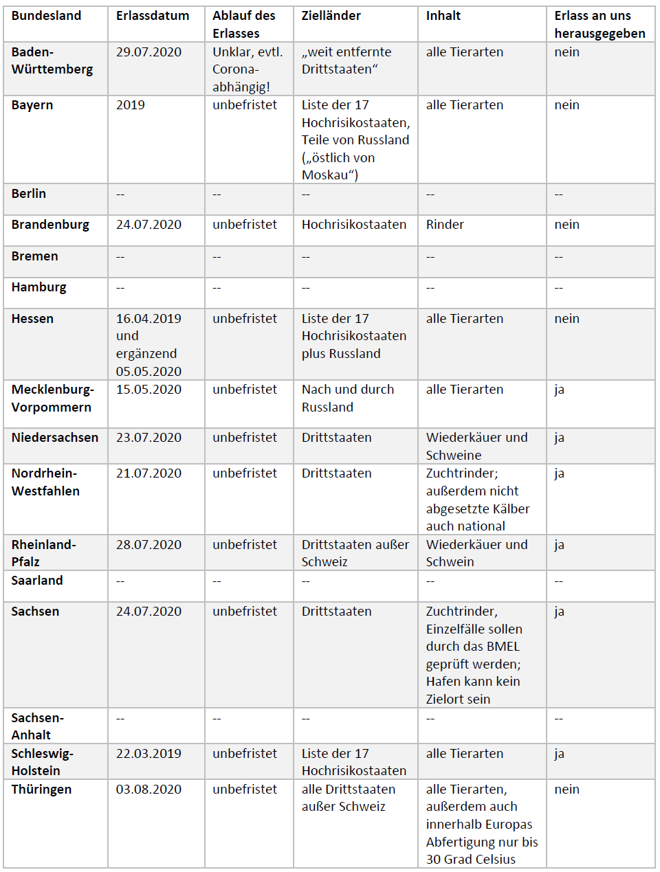 Nordrhein-Westfalen und Niedersachsen gaben ebenfalls einen Erlass an die Veterinärämter heraus, keine Lebendtierexporte mehr zu genehmigen. Für Rheinland-Pfalz haben wir noch einen Brief vorbereitet, sind aber gar nicht mehr dazu gekommen diesen auch abzuschicken – dort wurden Lebendtierexporte ebenfalls inzwischen verboten. Auch in Sachsen, Baden-Württemberg und Thüringen dürfen aktuell keine Lebendtierexporte in Drittstaaten mehr abgefertigt werden. In NRW und Rheinland-Pfalz sind sogar noch weitergehende Maßnahmen getroffen worden: Auch lange Kälbertransporte (über acht Stunden) dürfen von dort aus nicht mehr starten. Eine Übersicht über die Erlasse der Bundesländer finden Sie unten in der Tabelle.