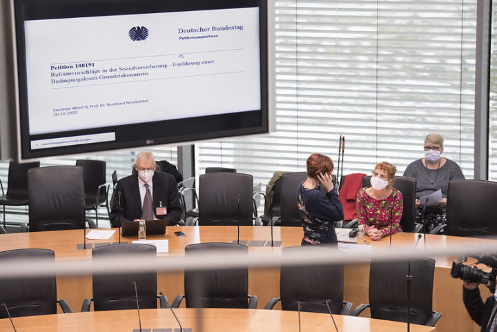 Die Anhörung von Susanne Wiest im Petitionsausschuss des Bundestags fand am 26. Oktober statt. Zusammen mit Prof. Dr. Neumärker von der Uni Freiburg stellte sie das Modell eines Krisen-Grundeinkommens vor, das jetzt in der Not der Corona-Maßnahmen unkompliziert verwirklicht werden könnte. Schnell zeigte sich in der Anhörung, dass das Grundeinkommen nicht nur kurzfristig, sondern ganz grundsätzlich für die Gestaltung der Zukunft hilfreich ist, indem es „Vertrauen statt Misstrauen und Kooperation statt Konkurrenz“ ermöglicht.