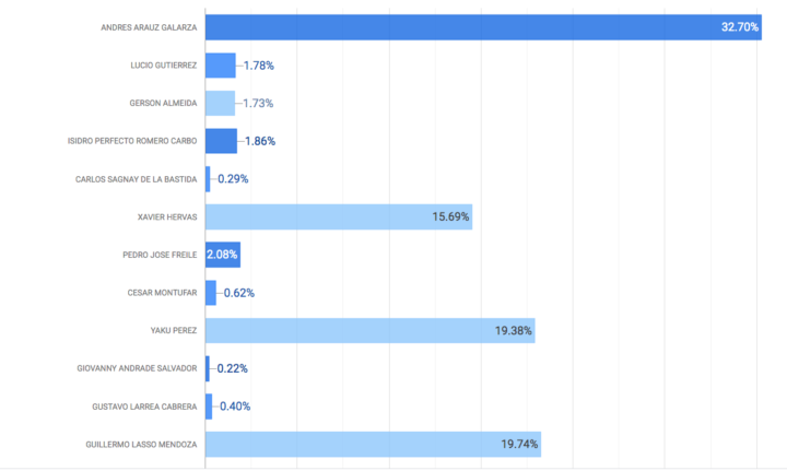 Mit dieser Entscheidung endet eine Woche, in welcher sowohl im In- als auch im Ausland die Augen auf eine zweite Wahlrunde gerichtet waren. Den ersten Platz belegte mit unbestreitbaren 32% der Kandidat Andrés Aráuz von der Bürgerrevolution, zusammen mit der Liste der Bewegung der Union für Hoffnung, der Mitte der Woche erklärte: „Wir werden uns in der zweiten Runde dem stellen, für den sich das ecuadorianische Volk entscheidet. Ich werde keine Präferenzen aussprechen, weder für den einen noch für den anderen, es soll einfach nur der Volkswille eingehalten werden.“, sagte er und fügte hinzu, dass sie sich vor keinem der beiden anderen Kandidaten in der zweiten Runde fürchten.