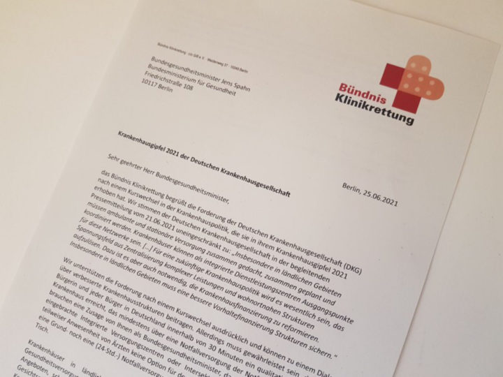 Das Bündnis Klinikrettung begrüßt die Forderung der Deutschen Krankenhausgesellschaft (DKG) nach einem Kurswechsel in der Krankenhauspolitik, die sie in ihrem Krankenhausgipfel 2021, der am 21. Juni stattfand, erhoben hat. Das Bündnis Klinikrettung stimmt der begleitenden Pressemitteilung der DKG vom 21. Juni zu. Dort formuliert die DKG: „Insbesondere in ländlichen Gebieten müssen ambulante und stationäre Versorgung zusammen gedacht, zusammen geplant und koordiniert werden. Krankenhäuser können als integrierte Dienstleistungszentren Ausgangspunkte für diese Netzwerke sein. […] Für eine zukünftige Krankenhauspolitik wird es wesentlich sein, das Spannungsfeld aus Zentralisierung komplexer Leistungen und wohnortnahen Strukturen aufzulösen. Dazu ist es aber auch notwendig, die Krankenhausfinanzierung zu reformieren. Insbesondere in ländlichen Gebieten muss eine bessere Vorhaltefinanzierung Strukturen sichern.“