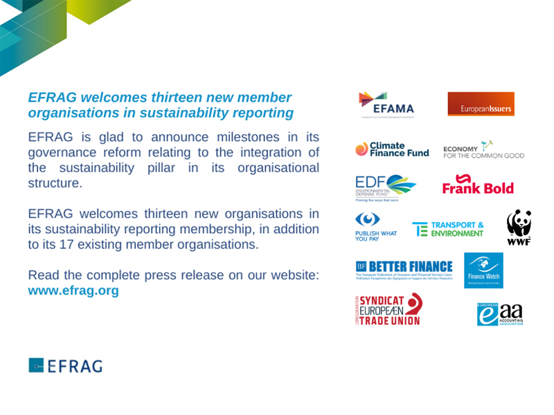 Die 13 Organisationen, die zusätzlich zu den 17 bereits bestehenden Stakeholdern neu als Mitglieder in den Expertenpool der EFRAG aufgenommen wurden, sind: