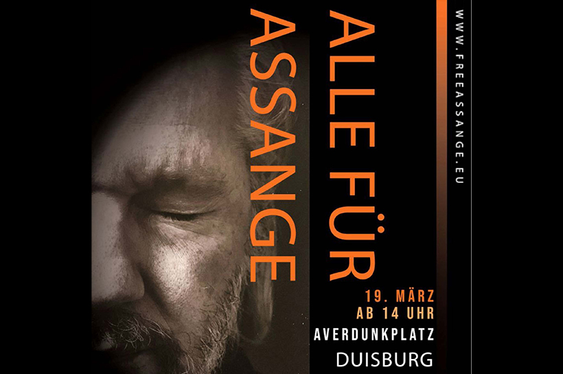 Am Samstag, 19. März findet in Duisburg eine Kundgebung für Julian Assange statt. Ab 14 Uhr gibt es am Duisburger Averdunkplatz (Nähe Hbf., Fußgängerzone/ Parkmöglichkeiten vorhanden) die Gelegenheit, sich mit Aktivist*innen aus dem gesamten Bundesgebiet zu vernetzen. Die Free Assange-Bewegung stellt sich vor und lädt Interessierte herzlich ein, sich zu beteiligen.