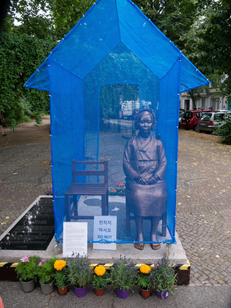 Die Friedensstatue symbolisiert sogenannte „Trostfrauen“, Opfer der sexuellen Sklaverei durch das japanische Militär, und verkündet eine Botschaft gegen sexualisierte Gewalt in Kriegszeiten weltweit und heute. Seit Anbeginn wurde die Statue unterschiedlich obstruiert. Die japanische Botschaft fordert durchgehend die Beseitigung. Neulich verlangte der japanische Premierminister Kishida bei Olaf Scholz’ Besuch in Japan von diesem persönlich die Entfernung der Skulptur.