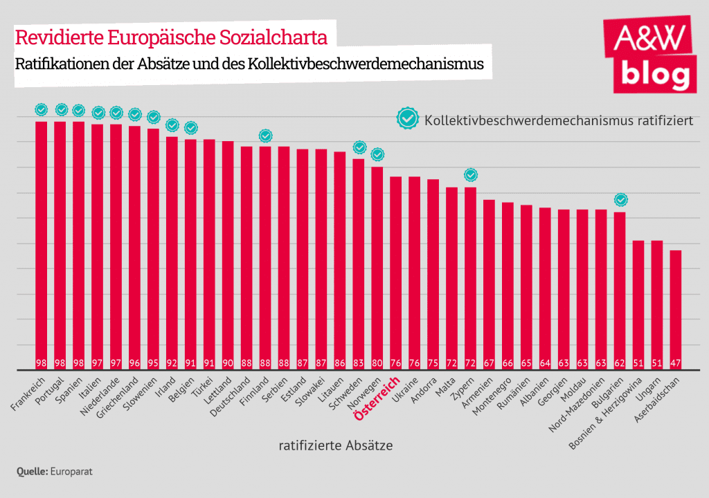 Die Europäische Sozialcharta (ESC) wird oft als Pendant zur Europäischen Menschenrechtskonvention oder auch als „soziale Verfassung Europas“ betrachtet. Sie verkörpert den im Hinblick auf soziale Rechte wichtigsten Menschenrechtsvertrag Europas. In der revidierten Fassung von 1996 wurde sie bisher von 35 der 46 Mitgliedstaaten des Europarats ratifiziert. Als zwischenstaatliche Organisation bildet der 1949 gegründete Europarat das Fundament des europäischen Integrationsprozesses und setzt sich seither für eine Stärkung von Demokratie und Menschenrechten in Europa ein. Eine Schwäche der Charta bleibt dabei die sogenannte „À-la-carte–Ratifizierung“. Zwar müssen die unterzeichnenden Staaten sechs von neun Kernbestimmungen (u. a. das Recht auf Arbeit, das Vereinigungsrecht und das Recht auf Kollektivverhandlungen) sowie insgesamt mindestens 16 Artikel bzw. 63 Absätze unterzeichnen, allerdings besteht keine Verpflichtung zur vollständigen Ratifikation. Das führt, speziell auf europäischer Ebene, zu einem rechtlichen „Fleckerlteppich“. Während Länder wie Frankreich, Spanien oder Portugal alle 98 Absätze der revidierten Europäischen Sozialcharta ratifiziert haben, hält Österreich mit heutigem Stand erst bei 76.