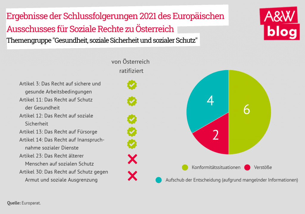 Neben den eingebrachten Kollektivbeschwerden wird die Einhaltung der Europäischen Sozialcharta auch im Rahmen zyklischer Begutachtungsverfahren überprüft. Im Zuge des letzten Begutachtungszyklus widmete sich der Europäische Ausschuss für Soziale Rechte der Themengruppe „Gesundheit, soziale Sicherheit und sozialer Schutz“. Diese umfasst unter anderem das Recht auf sichere und gesunde Arbeitsbedingungen (Artikel 3), Schutz der Gesundheit (Artikel 11) und soziale Sicherheit (Artikel 12). Im Zuge der Schlussfolgerungen 2021 wurde die Situation in Österreich dabei auf ihre Konformität mit insgesamt zehn Bestimmungen der Europäischen Sozialcharta geprüft, wobei zwei Verstöße festgestellt wurden. Beide basieren auf der Feststellung, dass Drittstaatsangehörige hierzulande von der vollen Nutzung des sozialen Netzes ausgeschlossen sind. Ein Befund, der nicht zuletzt aufgrund des restriktiven Staatsbürgerschaftsrechts problematisch ist.