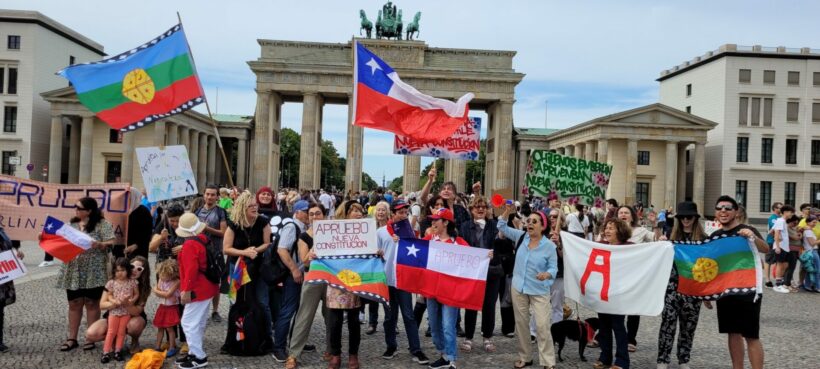 Lautstark schreien die in Berlin lebenden Chilenen ihre Unterstützung für die neue Verfassung in den Himmel Berlins. Über sie soll am 4 September dieses Jahres abgestimmt werden. Eine beeindruckende Gruppe von Demonstranten/innen hat sich mit ihren Parolen, Forderungen und Solidaritätsbekundungen vor dem Brandenburger Tor versammelt. Ihre transparente „Berlin/Deutschland unterstützt die neue Verfassung Chiles“ halten sie großflächig den Berlinern und Touristen entgegen. Dazu werden Lieder der Allende Ära und neue gesungen und es wird getanzt.