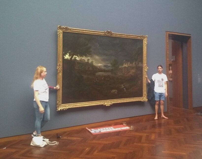 Aus Protest gegen den tödlichen fossilen Kurs der Bundesregierung haben sich heute Mittag zwei Mitglieder der Letzten Generation an das Gemälde „Gewitterlandschaft mit Pyramus und Thisbe“ von Nicolas Poussin im Städel Museum in Frankfurt (Main) geklebt.