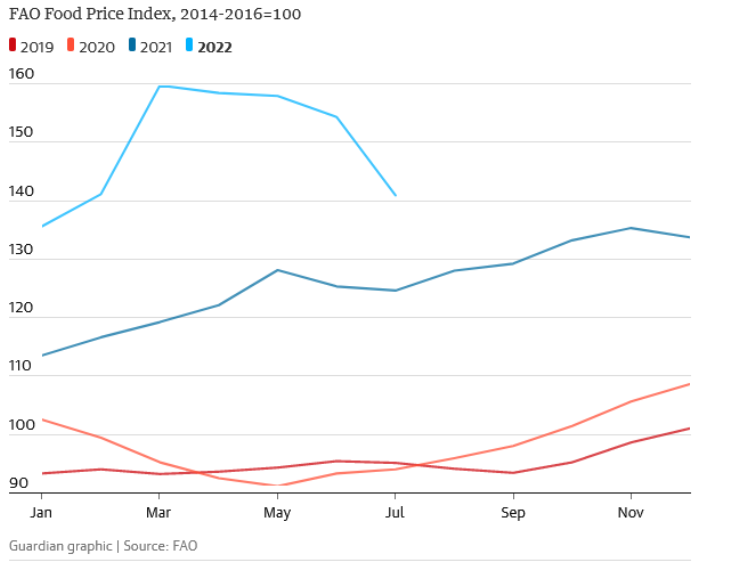 Entwicklung der Lebensmittelpreise 2019 bis 2022 im Vergleich zum Zeitraum 2014 bis 2016. © Daten: FAO/Grafik: The Guardian
