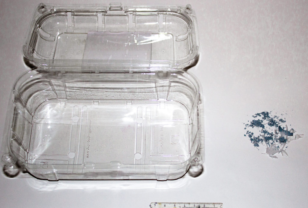 Von einer PET-Schale aus dem Supermarkt bleiben blieben nach dem Versuch lediglich Farbstoff und Reste von Schnittkanten zurück. © Christian Sonnendecker, Uni Leipzig