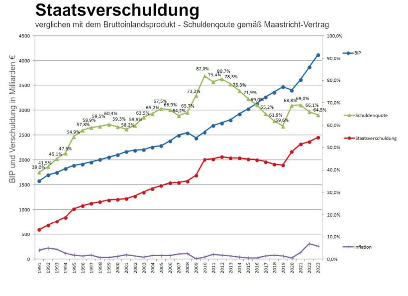Im obigen Diagramm ist die Staatsverschuldung als roter Graph eingezeichnet und Blau ist das Bruttoinlandsprodukt von der BRD. Der grüne Graph ist die Schuldenquote (Staatsschulden / BIP). Ganz unten habe ich die Inflation eingezeichnet, damit wir den Zusammenhang des starken Wachstums des BIPs seit 2021 und der Inflation sehen können, obwohl in Wahrheit die Wirtschaft unter den Corona-Maßnahmen, der Russlandsanktionen und höheren Leitzinsen leidet und geschrumpft sein müsste.